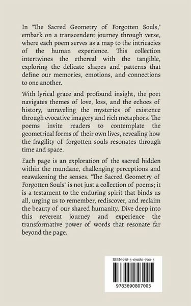 In "The Sacred Geometry of Forgotten Souls," embark on a transcendent journey through verse, where each poem serves as a map to the intricacies of the human experience. This collection intertwines the ethereal with the tangible, exploring the delicate shapes and patterns that define our memories, emotions, and connections to one another. With lyrical grace and profound insight, the poet navigates themes of love, loss, and the echoes of history, unraveling the mysteries of existence through evocative imagery and rich metaphors. The poems invite readers to contemplate the geometrical forms of their own lives, revealing how the fragility of forgotten souls resonates through time and space. Each page is an exploration of the sacred hidden within the mundane, challenging perceptions and reawakening the senses. "The Sacred Geometry of Forgotten Souls" is not just a collection of poems; it is a testament to the enduring spirit that binds us all, urging us to remember, rediscover, and reclaim the beauty of our shared humanity. Dive deep into this reverent journey and experience the transformative power of words that resonate far beyond the page.
