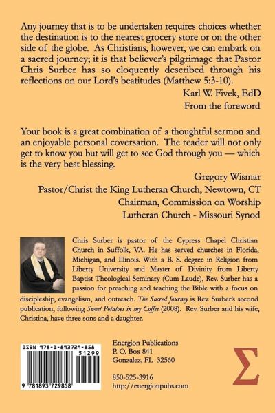 The Sacred Journey is a collection of insights, thoughts, and personal experiences centered on and emanating from the Beatitudes of Jesus from the Sermon on the Mount. Within its pages we are invited to consider the radical love with which God pursues His creation. God in Jesus Christ was determined to make a way for sinners to be forgiven at the Cross. While man had sinned and caused a divide between himself and His creator, God has insisted that those who receive the grace and mercy offered in His Son shall be forgiven of sin and reconciled unto God in eternally secure love. God in salvation is singly focused on reconciling all who will place their trust, their faith, and their hope in that sacrifice. It is not we who make our way to God through good works, right belief, perfectly ordered creedal statements, or any other edifice of human composition. It is God who pursues us heatedly to receive the radical beauty of the violence of the Cross. God has pursued, forgiven, and reconciled us unto Himself. Through the wrath which was poured out upon Jesus, mercy was poured out on us. Salvation is purely the work of God's mercy and grace. We who have received Him have done so by faith when we have responded to the pull of God on our hearts. Grace rests upon us because God has loved us. What, in response to such a violent grace, should our reply to God be?