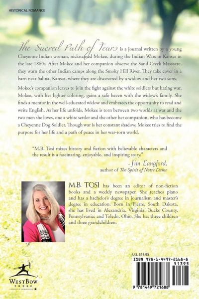 The Sacred Path of Tears is a journal written by a young Cheyenne Indian woman, nicknamed Mokee, during the Indian Wars in Kansas in the late 1860s. After Mokee and her companion observe the Sand Creek Massacre, they warn the other Indian camps along the Smoky Hill River. They take cover in a barn near Salina, Kansas, where they are discovered by a widow and her two sons. Mokee's companion leaves to join the fight against the white soldiers but hating war, Mokee, with her lighter coloring, gains a safe haven with the widow's family. She finds a mentor in the well-educated widow and embraces the opportunity to read and write English. As her life unfolds, Mokee is torn between two worlds at war and the two men she loves, one a white settler and the other her companion, who has become a Cheyenne Dog Soldier. Though war is her constant shadow, Mokee tries to find the purpose for her life and a path of peace in her war-torn world. "M.B. Tosi mixes history and fiction with believable characters and the result is a fascinating, enjoyable, and inspiring story." - Jim Langford, author of The Spirit of Notre Dame