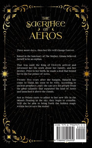 Three more days... then her life will change forever. Raised in the Sanctuary of The Mother, Oriana believed herself to be an orphan. That was until the King of Elswyth arrived and informed her the truth about her family, and her destiny. Prior to her birth, he made a deal that bound her to the fae prince of Aeros. Twenty five years after the bargain, Malachi has come to claim his soon to be wife. According to ancient prophecy, only she can save his people from the great calamity that separated the land of Aeros and launched it above the clouds. Just as Oriana starts to adjust to her new life in the islands floating in the sky, they begin to crumble. Will she be able to bring forth the hidden magic within her to save the realm? The Sacrifice of Aeros is a complete stand-alone novella in the Realms of Elswyth Series. If you are a fan of arranged marriage, hidden magic, MMCs with wings, and a happily ever after you do not want to miss out on this book is for you!