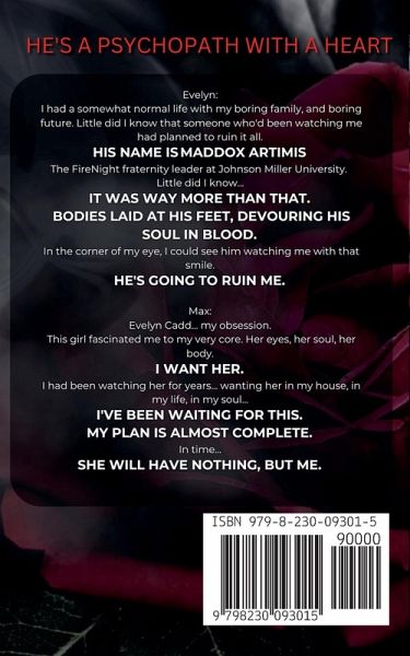 HE'S A PSYCHOPATH WITH A HEART. Evelyn: I had a somewhat normal life with my boring family, and boring future. Little did I know that someone who'd been watching me had planned to ruin it all. His name is¿Maddox Artimis The FireNight fraternity leader at Johnson Miller University. Little did I know... It was way more than that. Bodies laid at his feet, devouring his soul in blood. In the corner of my eye, I could see him watching me with that smile. He's going to ruin me. Max: Evelyn Cadd... my obsession. This girl fascinated me to my very core. Her eyes, her soul, her body. I want her. I had been watching her for years... wanting her in my house, in my life, in my soul... I've been waiting for this. My plan is almost complete. In time... She will have nothing, but me.