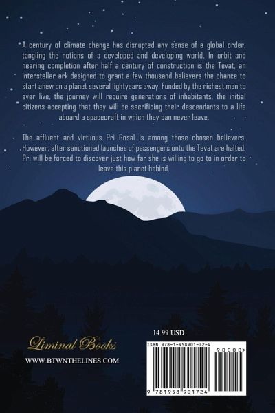 A century of climate change has disrupted any sense of a global order, tangling the notions of a developed and developing world. In orbit and nearing completion after half a century of construction is the Tevat, an interstellar ark designed to grant a few thousand believers the chance to start anew on a planet several lightyears away. Funded by the richest man to ever live, the journey will require generations of inhabitants, the initial citizens accepting that they will be sacrificing their descendants to a life aboard a spacecraft in which they can never leave. The affluent and virtuous Pri Gosal is among those chosen believers. However, after sanctioned launches of passengers onto the Tevat are halted, Pri will be forced to discover just how far she is willing to go to in order to leave this planet behind.