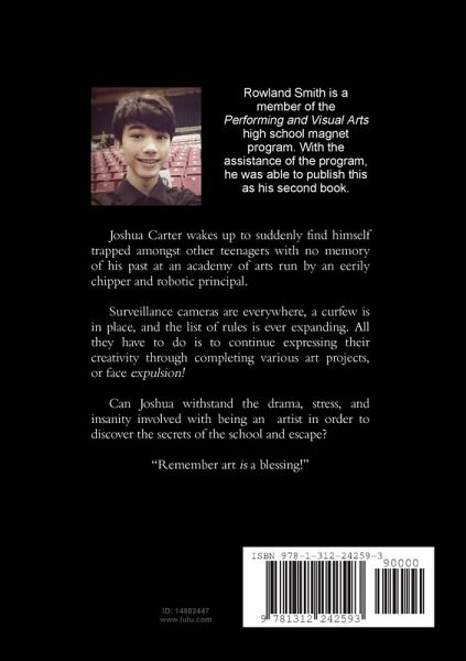 The Sadistic Arts is Rowland Smith's second, (and first official) published book. Based around the character Joshua Carter and his experience in The School of Golden Arts. Joshua Carter wakes up to suddenly find himself trapped amongst other teenagers with no memory of his past at an academy of arts run by an eerily chipper and robotic principal. Surveillance cameras are everywhere, a curfew is in place, and the list of rules is ever expanding. All they have to do is to continue expressing their creativity through completing various art projects, or face expulsion! Can Joshua withstand the drama, stress, and insanity involved with being an artist in order to discover the secrets of the school and escape? "Remember art is a blessing!"