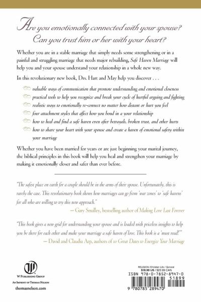 Creating a safe haven for each other in a marriage can enable a couple to weather any storm. Yet that accomplishment is certainly easier said than done. Psychologists Arch Hart, Ph.D, and Sharon Hart May, Ph.D., present a detailed blueprint for establishing a marital safe haven so that couples can count on each other and avoid criticizing, blaming and shutting out their partners during tough times. Based on a new therapeutic approach that involves establishing a feeling of "safety," out of which commitment and the other necessary elements of a lasting and fulfilling relationship can grow.