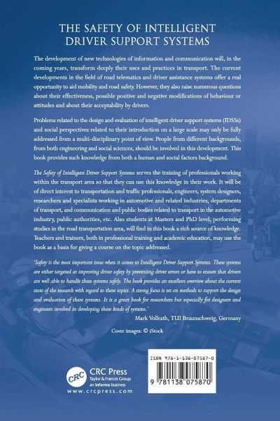 The development of new technologies of information and communication will, in the coming years, transform deeply their uses and practices in transport. The current developments in the field of road telematics and driver assistance systems offer a real opportunity to aid mobility and road safety. However, they also raise numerous questions about their effectiveness, possible positive and negative modifications of behaviour or attitudes and about their acceptability by drivers. Problems related to the design and evaluation of intelligent driver support systems (IDSSs) and social perspectives related to their introduction on a large scale may only be fully addressed from a multi-disciplinary point of view. People from different backgrounds, from both engineering and social sciences, should be involved in this development. This book provides such knowledge from both a human and social factors background. The Safety of Intelligent Driver Support Systems serves the training of professionals working within the transport area so that they can use this knowledge in their work. It will be of direct interest to transportation and traffic professionals, engineers, system designers, researchers and specialists working in automotive and related industries, departments of transport, and communication and public bodies related to transport in the automotive industry, public authorities, etc. Also students at Masters and PhD level, performing studies in the road transportation area, will find in this book a rich source of knowledge. Teachers and trainers, both in professional training and academic education, may use the book as a basis for giving a course on the topic addressed.