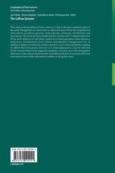 Crocus sativus saffron: A 360 degree overview.- Reference genome of Saffron "The Golden condiment".- "SaffronOMICS: Novel approaches towards putting saffron data at work".- Bioinformatics for saffron-omics and crop improvement.- Genetic mapping and molecular markers in Saffron.- Soil Classification, Nutrient Management and Land Cover of Saffron Growing Areas of Kashmir Valley.- Cultromic and metabarcodic insights into saffron-microbiome associations.- "Saffron, bacteria and mycorrhiza".- Diversity and bioprospection of fungal endophytic microbiome of Crocus sativus L. (saffron).- Epidemiology and Management of Corm Rot of Saffron.- Pathogenicity and genetic diversity of microbes in Crocus sativus L. and various strategies combating diseases.- Tissue culture techniques for Saffron improvement.- Saffron production under control condition.- Saffron: Metabolomics and quality points of view.- Saffron in phytotherapy : Pharmocological properties and medicinal uses.- Economic Aspects of Saffron in the World.- Marketing prospects for Saffron in domestic market: the case of Moroccan PDO.