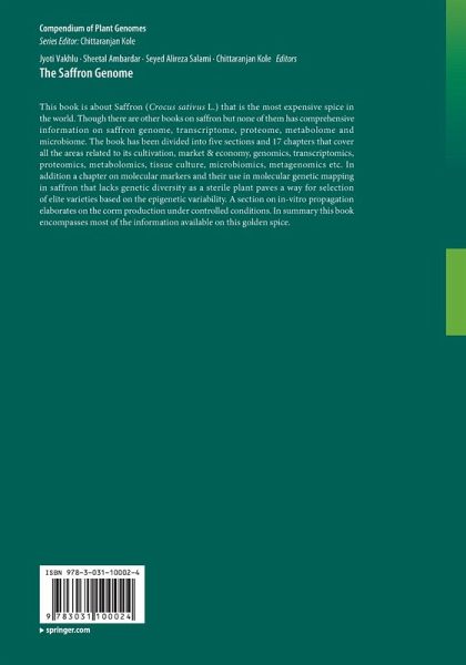 Crocus sativus saffron: A 360 degree overview.- Reference genome of Saffron "The Golden condiment".- "SaffronOMICS: Novel approaches towards putting saffron data at work".- Bioinformatics for saffron-omics and crop improvement.- Genetic mapping and molecular markers in Saffron.- Soil Classification, Nutrient Management and Land Cover of Saffron Growing Areas of Kashmir Valley.- Cultromic and metabarcodic insights into saffron-microbiome associations.- "Saffron, bacteria and mycorrhiza".- Diversity and bioprospection of fungal endophytic microbiome of Crocus sativus L. (saffron).- Epidemiology and Management of Corm Rot of Saffron.- Pathogenicity and genetic diversity of microbes in Crocus sativus L. and various strategies combating diseases.- Tissue culture techniques for Saffron improvement.- Saffron production under control condition.- Saffron: Metabolomics and quality points of view.- Saffron in phytotherapy : Pharmocological properties and medicinal uses.- Economic Aspects of Saffron in the World.- Marketing prospects for Saffron in domestic market: the case of Moroccan PDO.