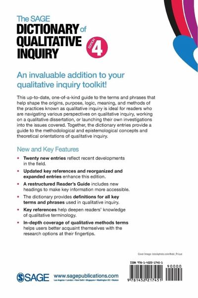 In this Fourth Edition of The SAGE Dictionary of Qualitative Inquiry Thomas A. Schwandt provides a guide to the terms and phrases that help shape the origins, purpose, logic, meaning, and methods of the practices known
