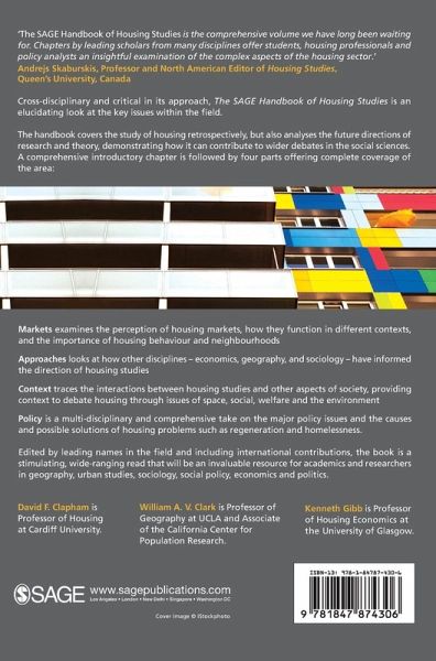 Preface PART ONE: HOUSING MARKETS - Kenneth Gibb Understanding Housing Markets: Real Progress or Stalled Agendas? - Duncan MacLennan House-Building and Housing Supply - Michael Ball Housing Behaviour - Maarten van Ham Residential Mobility and the Housing Market - William A.V. Clark Neighbourhoods and Their Role in Creating and Changing Housing - George Galster PART TWO: APPROACHES - David Clapham The Neo-Liberal Legacy to Housing Research - Christine M. E. Whitehead Institutional Economics - Kenneth Gibb Social Geographic Interpretations of Housing Spaces - Tim Butler and Chris Hamnett Social Policy Approaches to Housing Research - David Clapham Social Constructionism and beyond in Housing Research - David Clapham A Review of Structurally Inspired Approaches in Housing Studies: Concepts, Contributions and Future Perspectives - Julie Lawson Housing Politics and Political Science - Bo Bengtsson People: Environment Studies - Roderick Lawrence PART THREE: CONTEXT - William A. V. Clark Housing and the Economy - Geoffrey Meen Housing and Welfare Regimes - Walter Matznetter and Alexis Mundt Housing Markets, the Life Course and Migration up and down the Urban Hierarchy - Christopher Bitter and David A. Plane Housing and Social Life - Ray Forrest Housing: From Low Energy to Zero Carbon - Phillip Jones PART FOUR: POLICY ISSUES - Kenneth Gibb Homelessness - Suzanne Fitzpatrick Affordable Housing - Chris Leishman and Steven Rowley Housing Subsidies - Judith Yates Ethnic Residential Segregation: Reflections on Concepts, Levels and Effects - Sako Musterd Social Consequences of Residential Segregation and Mixed Neighbourhoods - Ronald van Kempen and Gideon Bolt Managing Social Housing - Hugo Priemus Conclusion - David Clapham