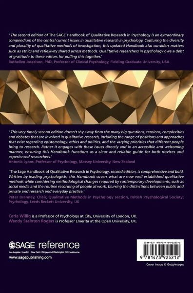 One of our bestselling handbooks, The SAGE Handbook of Qualitative Research in Psychology, is back for a second edition. Since the first edition qualitative research in psychology has been transformed. Responding to this, existing chapters have been updated, and three new chapters introduced on Thematic Analysis, Interpretation and Netnography. With a focus on methodological progress throughout, the chapters are organised into three sections: