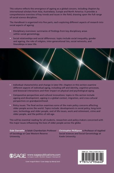 "This SAGE Handbook integrates basic research on social dimensions of aging. It presents programmatic applications of research in areas not often seen in Handbooks including imprisonment, technology and aging, urban society aged, and elderly migration. The authors constitute a Who's Who of international gerontology, and the focus on globalization and aging is unique among Handbooks today. This Handbook should be in the library of every social gerontologist." - Vern L. Bengtson, Professor of Gerontology, University of Southern California This volume reflects the emergence of ageing as a global concern, including chapters by international scholars from Asia, Australasia, Europe and North America. It provides a comprehensive overview of key trends and issues in the field, drawing upon the full range of social science disciplines. The Handbook is organized into five parts, each exploring different aspects of research into social aspects of ageing: * Disciplinary overviews: summaries of findings from key disciplinary areas within social gerontology. * Social relationships and social differences: explores area like social inequality, gender, religion, inter-generational ties, social networks, and friendships. * Individual characteristics and change in later life: examines different aspects of individual aging, including self and identity, cognitive processes, and bio-social interactions and their impact on physical and psychological aging. * Comparative perspectives and cultural innovations: topics include ageing and development, ageing in a global context, migration, and cross-cultural perspectives on grandparenthood. * Policy issues: covering policy concerns such aslong-term care, technology and older people, end of life issues, work and retirement, and the politics of old age. This will be essential reading for all students, researchers and policy-makers concerned with the major issues influencing the lives of older people across the globe.