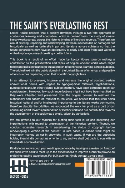 The Saint's Everlasting Rest: Or, A Treatise Of The Blessed State Of The Saints In Their Enjoyment Of God In Heaven. Abridged By Benjamin Fawcett. M. A. This book is a result of an effort made by us towards making a contribution to the preservation and repair of original classic literature. In an attempt to preserve, improve and recreate the original content, we have worked towards: 1. Type-setting & Reformatting: The complete work has been re-designed via professional layout, formatting and type-setting tools to re-create the same edition with rich typography, graphics, high quality images, and table elements, giving our readers the feel of holding a 'fresh and newly' reprinted and/or revised edition, as opposed to other scanned & printed (Optical Character Recognition - OCR) reproductions. 2. Correction of imperfections: As the work was re-created from the scratch, therefore, it was vetted to rectify certain conventional norms with regard to typographical mistakes, hyphenations, punctuations, blurred images, missing content/pages, and/or other related subject matters, upon our consideration. Every attempt was made to rectify the imperfections related to omitted constructs in the original edition via other references. However, a few of such imperfections which could not be rectified due to intentional\unintentional omission of content in the original edition, were inherited and preserved from the original work to maintain the authenticity and construct, relevant to the work. We believe that this work holds historical, cultural and/or intellectual importance in the literary works community, therefore despite the oddities, we accounted the work for print as a part of our continuing effort towards preservation of literary work and our contribution towards the development of the society as a whole, driven by our beliefs. We are grateful to our readers for putting their faith in us and accepting our imperfections with regard to preservation of the historical content. HAPPY READING!