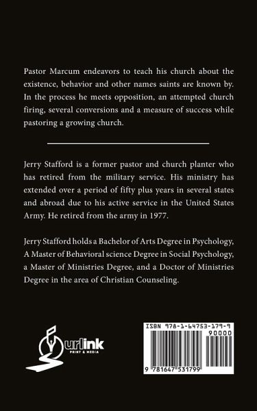 Pastor Marcum endeavors to teach his church about the existence, behavior and other names saints are known by. In the process he meets opposition, an attempted church firing, several conversions and a measure of success while pastoring a growing church. Jerry Stafford is a former pastor and church planter who has retired from the military service. His ministry has extended over a period of fifty plus years in several states and abroad due to his active service in the United States Army. He retired from the army in 1977. Jerry Stafford holds a Bachelor of Arts Degree in Psychology, A Master of Behavioral science Degree in Social Psychology, a Master of Ministries Degree, and a Doctor of Ministries Degree in the area of Christian Counseling.