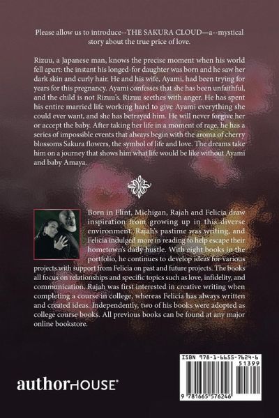 Please allow us to introduce--THE SAKURA CLOUD-a--mystical story about the true price of love. Rizuu, a Japanese man, knows the precise moment when his world fell apart: the instant his longed-for daughter was born and he saw her dark skin and curly hair. He and his wife, Ayami, had been trying for years for this pregnancy. Ayami confesses that she has been unfaithful, and the child is not Rizuu's. Rizuu seethes with anger. He has spent his entire married life working hard to give Ayami everything she could ever want, and she has betrayed him. He will never forgive her or accept the baby. After taking her life in a moment of rage, he has a series of impossible events that always begin with the aroma of cherry blossoms Sakura flowers, the symbol of life and love. The dreams take him on a journey that shows him what life would be like without Ayami and baby Amaya.