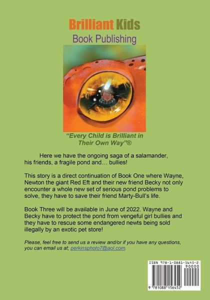 Book Two has 76 pages, 33 illustrations and introduces the amazing eleven year old Becky Hage, new in town because her Dad, Dr. Jim Hage, just moved his large and small animal Veterinary practice to Lake Luzerne after the towns previous and only Vet retired. Becky and Wayne not only have a whole new set of problems at the pond to solve they have to save the life of their friend Marty-Bull the beaver who was shot with an arrow after trying to warn them! Each book continues where the last one left off. Book Three is available right now on amazon.com. Wayne and Becky have to protect the pond from vengeful girl bullies and they have to rescue some endangered newts being sold illegally by an exotic pet store! Books Four and Five are being written right now. We are very curious to see what you think of the new character Becky. Thank you for your interest.