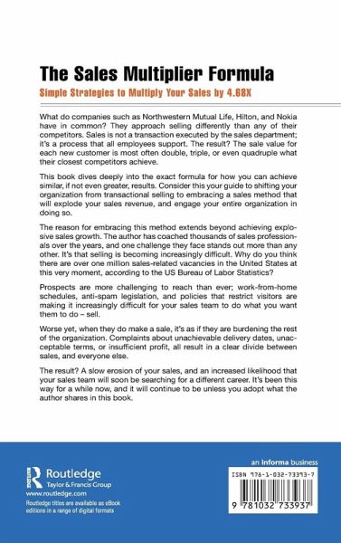 Part 1: Selling is an Inside Job Chapter 1: How Your Customers Buy Has Changed Chapter 2: Your Secret Ingredient to Multiply Sales Chapter 3: Why Your Sales Are Stagnant Chapter 4: Selling Today is a Team Sport Part 2: Your 4.68X Selling Opportunity Chapter 5: The Initial Sale is Small Potatoes Chapter 6: Good: Every Good Sale Deserves an Upsell Chapter 7: Better: Introduce Creative Cross-Selling Chapter 8: Best: Generating Unstoppable Referrals Part 3: Building Momentum with Your Sales Multiplier Formula Chapter 9: The Foundation: Build A Sales Centric Culture Chapter 10: Foundation: Design Your Sales Multiplier Formula Chapter 11: Testing: Implement Your New Sales Multiplier Formula Chapter 12: Winning the Race for New Customers