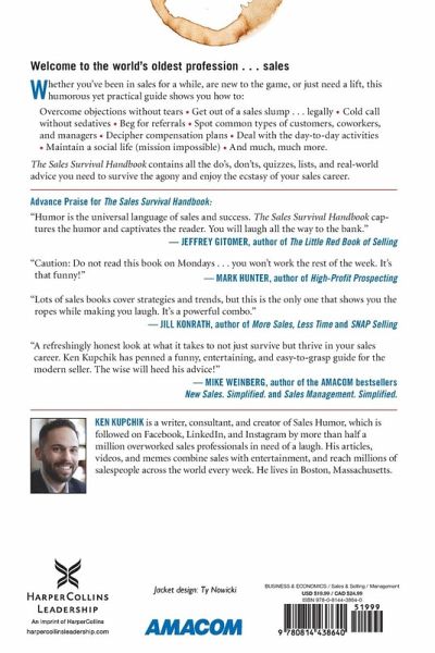From the cold calling, to commissions and caffeine addiction, learn the real hard truth about life in the sales profession. Lying customers. Changing quotas. Soul-crushing management. PSSD-inducing pressure (Post Sales Stress Disorder). What's not to love about the world of sales? Whether you've been in sales for a while, are new to the game, or just need a lift, The Sales Survival Handbook shows you how to: Overcome objections without tears (yours and theirs) Get out of a sales slump legally Cold call without needing sedatives Beg for referrals (yes, beg) Spot common types of customers, coworkers, and managers Maintain a social life (mission impossible?) Complete with quizzes, lists, real-world advice, and all the dos and don'ts that have popped up thus far in the sales world, The Sales Survival Handbook offers you everything you need to survive the agony and enjoy the ecstasy of your sales career.