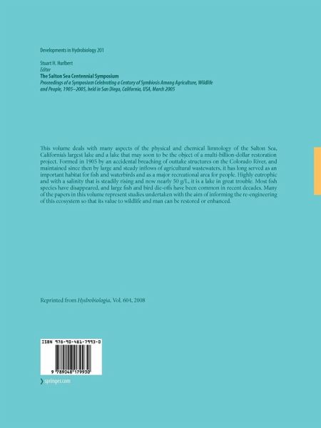 This volume deals with many aspects of the physical and chemical limnology of the Salton Sea, California's largest lake and a lake that may soon to be the object of a multi-billion dollar restoration project. Formed in 1905 by an accidental breaching of outtake structures on the Colorado River, and maintained since then by large and steady inflows of agricultural wastewaters, it has long served as an important habitat for fish and waterbirds and as a major recreational area for people. Highlly eutrophic and with a salinity that is steadily rising and now nearly 50 g/L, it is a lake in great trouble. Most fish species have disappeared, and large fish and bird dieoffs have been common in recent decades. Many of the papers in this volume represent studies undertaken with the aim of informing the re-engineering of this ecosystem so that its value to wildlife and man can be restored or enhanced.