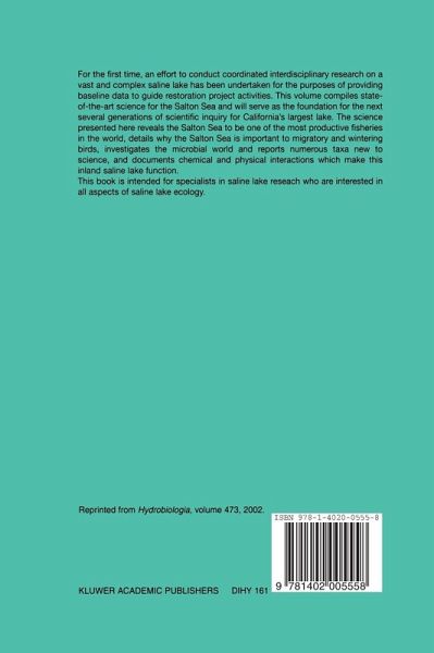 Chemical and physical characteristics of the Salton Sea, California.- Chemical evolution of the Salton Sea, California: nutrient and selenium dynamics.- Characteristics and contaminants of the Salton Sea sediments.- Reconstruction of prehistoric Lake Cahuilla in the Salton Sea Basin using GIS and GPS.- Simulation of wind-driven circulation in the Salton Sea: implications for indigenous ecosystems.- Preliminary studies of cyanobacteria, picoplankton, and virioplankton in the Salton Sea with special attention to phylogenetic diversity among eight strains of filamentous cyanobacteria.- Flagellate Cryptobia branchialis (Bodonida: Kinetoplastida), ectoparasite of tilapia from the Salton Sea.- Metazooplankton dynamics in the Salton Sea, California, 1997-1999.- Freeliving nematodes from the Salton Sea.- Cryptomonads from the Salton Sea, California.- The benthic invertebrates of the Salton Sea: distribution and seasonal dynamics.- Naked amoebae (Protozoa) of the Salton Sea, California.- The diatom flora of the Salton Sea, California.- Invertebrates of the Salton Sea: a scanning electron microscopy portfolio.- Skeletal development in Hermesinum adriaticum Zacharias, a flagellate from the Salton Sea, California.- Summer movements of desert pupfish among habitats at the Salton Sea.- Fish biology and fisheries ecology of the Salton Sea, California.- Biology and migration of Eared Grebes at the Salton Sea.- The Salton Sea as critical habitat to migratory and resident waterbirds.- Possible importance of algal toxins in the Salton Sea, California.- Avian disease at the Salton Sea.
