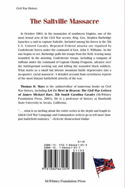 In October 1864, in the mountains of southwest Virginia, one of the most brutal acts of the Civil War occurs. Brig. Gen. Stephen Burbridge launches a raid to capture Saltville. Included among his forces is the 5th U.S. Colored Cavalry. Repeated Federal attacks are repulsed by Confederate forces under the command of Gen. John S. Williams. As the sun begins to set, Burbridge pulls his troops from the field, leaving many wounded. In the morning, Confederate troops, including a company of ruffians under the command of Captain Champ Ferguson, advance over the battleground seeking out and killing the wounded black soldiers. What starts as a small but intense mountain battle degenerates into a no-quarter, racial massacre. A detailed account from eyewitness reports of the most blatant battlefield atrocity of the war.