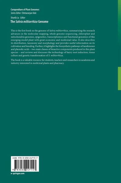 Introduction to Salvia miltiorrhiza.- Salvia miltiorrhiza resources, cultivation and breeding.- Molecular maps and mapping of genes and QTLs of Salvia miltiorrhiza.- The genome of Salvia miltiorrhiza.- The chloroplast and mitochondria genomes of Salvia miltiorrhiza.- Salvia miltiorrhiza epigenetics.- Salvia miltiorrhiza transcriptomics.- Gene expression regulation in Salvia miltiorrhiza.- Bioinformatics tools for Salvia miltiorrhiza functional genomics.- Biochemistry, biosynthesis and medicinal properties of tanshinones.- Biochemistry, biosynthesis and medicinal properties of phenolic acids.- Hairy root induction and tissue culture of Salvia miltiorrhiza.- Genetic transformation of Salvia miltiorrhiza.