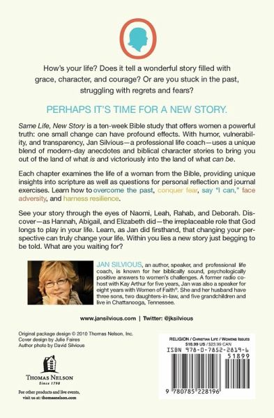 Move from what" is" to what "can be" by changing how you think and talk to yourself. Using powerful character studies of ten women from Scripture, as well as modern-day stories from her work as a professional life coach, Bible teacher Jan Silvious helps women choose new stories instead of dumping, or wallowing in, their old lives. Naomi, Leah, Rahab, Deborah, Hannah, Anna, Jehosheba, Abigail, Naaman's servant girl, and Elizabeth round out the cast of characters who, with their own stories, help readers find new perspectives with amazing results. Chapters include: Realize it's timeDon't be held hostage by the pastAsk yourself good questionsChange your "I can't" to "I can"Delete the drama of the dayForget the "What might have beens"Discover the power of wisdom and courageGet past the resistance of fearChoose to bounce backThe last chapter has not been written yet