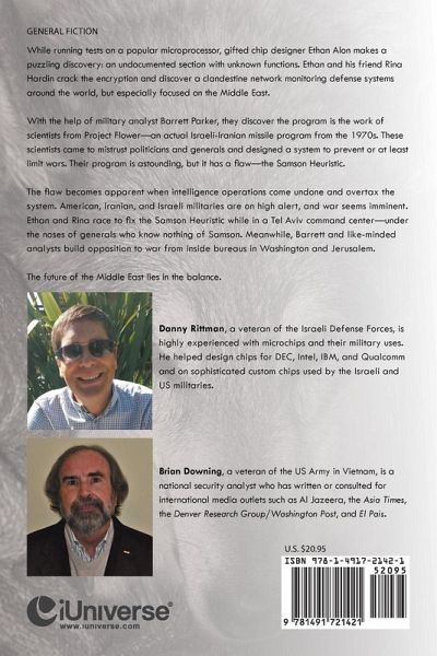 While running tests on a popular microprocessor, gifted chip designer Ethan Alon makes a puzzling discovery: an undocumented section with unknown functions. Ethan and his friend Rina Hardin crack the encryption and discover a clandestine network monitoring defense systems around the world, but especially focused on the Middle East. With the help of military analyst Barrett Parker, they discover the program is the work of scientists from Project Flower-an actual Israeli-Iranian missile program from the 1970s. These scientists came to mistrust politicians and generals and designed a system to prevent or at least limit wars. Their program is astounding, but it has a flaw-the Samson Heuristic. The flaw becomes apparent when intelligence operations come undone and overtax the system. American, Iranian, and Israeli militaries are on high alert, and war seems imminent. Ethan and Rina race to fix the Samson Heuristic while in a Tel Aviv command center-under the noses of generals who know nothing of Samson. Meanwhile, Barrett and like-minded analysts build opposition to war from inside bureaus in Washington and Jerusalem. The future of the Middle East lies in the balance.