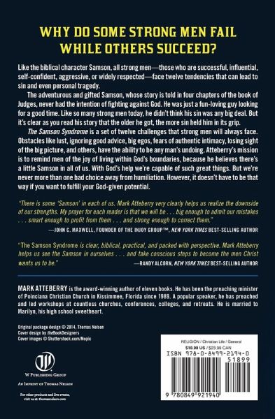 The Samson Syndrome is a set of twelve tendencies that men face. Obstacles like lust, ignoring good advice, fears of authentic intimacy, and others, have the ability to be any man's undoing. Atteberry's mission is to remind men of the joy of living within God's boundaries, because he believes there's a little Samson in all of us.