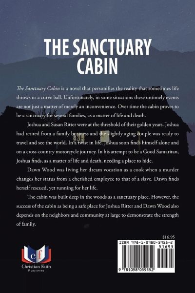 The Sanctuary Cabin is a novel that personifies the reality that sometimes life throws us a curve ball. Unfortunately, in some situations these untimely events are not just a matter of merely an inconvenience. Over time the cabin proves to be a sanctuary for several families, as a matter of life and death. Joshua and Susan Ritter were at the threshold of their golden years. Joshua had retired from a family business and the slightly aging couple was ready to travel and see the world. In a twist in life, Joshua soon finds himself alone and on a cross-country motorcycle journey. In his attempt to be a Good Samaritan, Joshua finds, as a matter of life and death, needing a place to hide. Dawn Wood was living her dream vocation as a cook when a murder changes her status from a cherished employee to that of a slave. Dawn finds herself rescued, yet running for her life. The cabin was built deep in the woods as a sanctuary place. However, the success of the cabin as being a safe place for Joshua Ritter and Dawn Wood also depends on the neighbors and community at large to demonstrate the strength of family.