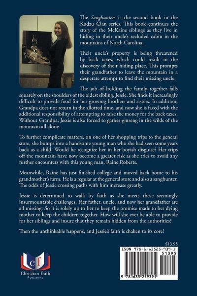 The Sanghunters is the second book in the Kudzu Clan series. This book continues the story of the McKaine siblings as they live in hiding in their uncle's secluded cabin in the mountains of North Carolina. Their uncle's property is being threatened by back taxes, which could result in the discovery of their hiding place. This prompts their grandfather to leave the mountain in a desperate attempt to find their missing uncle. The job of holding the family together falls squarely on the shoulders of the oldest sibling, Jessie. She finds it increasingly difficult to provide food for her growing brothers and sisters. In addition, Grandpa does not return in the allotted time, and now she is faced with the additional responsibility of attempting to raise the money for the back taxes. Without Grandpa, Jessie is also forced to gather ginseng in the wilds of the mountain all alone. To further complicate matters, on one of her shopping trips to the general store, she bumps into a handsome young man who she had seen some years back as a child. Would he recognize her in her boyish disguise? Her trips off the mountain have now become a greater risk as she tries to avoid any further encounters with this young man, Raine Roberts. Meanwhile, Raine has just finished college and moved back home to his grandmother's farm. He is a regular at the general store and also a sanghunter. The odds of Jessie crossing paths with him increase greatly. Jessie is determined to walk by faith as she meets these seemingly insurmountable challenges. Her father, uncle, and now her grandfather are all missing. So it is solely up to her to keep the promise made to her dying mother to keep the children together. How will she ever be able to provide for her siblings and insure that they remain hidden from the authorities? Then the unthinkable happens, and Jessie's faith is shaken to its core!