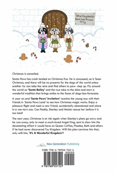 Christmas is cancelled. Santa Paws has crash landed on Christmas Eve. He is concussed, as is Team Christmas, and there will be no presents for the dogs of the world unless another fur can take the reins and find others to paw-step up. Fly around the world as 'Santa Bailey' and the tzus take to the skies and start a wonderful tradition that brings smiles to the faces of dogs-less-fortunate. A year on and 'Santa Paws' Invitation' reunites the young tzus with their friends in 'Santa Paws Land' to see how Christmas magic works. Enjoy a pleasure flight and meet a new friend, accidentally abandoned and alone in a war-torn zoo. Can Paddy, Stanley and Maisie rescue her before it is too late? The next year, Christmas is at risk again when Stanley's plans go awry and he runs away, only to meet a much-loved Angel King, sent to show him the devastating effect it would have on Queen Coffee, Phoebe, Beth and others if he had never discovered Tzu Kingdom. Will this plan convince him that, only with him, 'It's A Wonderful Kingdom'?