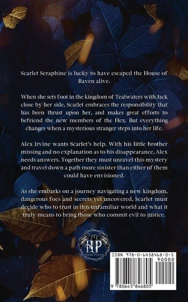 Scarlet Seraphine is lucky to have escaped the House of Raven alive. When she sets foot in the kingdom of Tealwaters with Jack close by her side, Scarlet embraces the responsibility that has been thrust upon her, and makes great efforts to befriend the new members of the Hex. But everything changes when a mysterious stranger steps into her life. Alex Irvine wants Scarlet's help. With his little brother missing and no explanation as to his disappearance, Alex needs answers. Together they must unravel this mystery and travel down a path more sinister than either of them could have envisioned. As she embarks on a journey navigating a new kingdom, dangerous foes and secrets yet uncovered, Scarlet must decide who to trust in this unfamiliar world and what it truly means to bring those who commit evil to justice. New Adult - Fantasy - Steamy Romance - Mature Themes