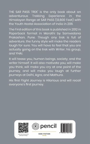 THE SAR PASS TREK' is the only book about an adventurous Trekking Experience in the Himalayan Range at SAR PASS (13,800 Feet) with the Youth Hostel Association of India in 2011. The First edition of this book is published in 2012 in Paperback format in Marathi by Samvedana Prakashan, Pune. Though any trek is full of adventure, the funny style will make the readers laugh for sure. You will have to feel that you are actually going on the trek with Writer, his group, and YHAI. It will tease you, human beings, society, and the writer himself. It will also motivate you, will make you think, will make you cry at one point of the journey, and will make you laugh at further journeys at Delhi, Agra, and Mathura. His first Flight Journey is Hilarious and will recall everyone's first journey.
