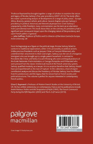 Professor Raymond has brought together a range of scholars to examine the nature and legacy of Nicolas Sarkozy's five-year presidency (2007 2012). The study offers the reader a penetrating analysis of developments in a range of policy areas Europe, Africa, diversity, pension reform, and culture. Several chapters also put Sarkozy's presidency in political, historical, and theoretical perspective. Given Sarkozy's unpopularity while President, many commentators saw his term as an aberration from a presidential norm. This book shows that, on the contrary, his presidency had a significant and consequent impact upon the changing nature of the presidency and upon French politics in general.'