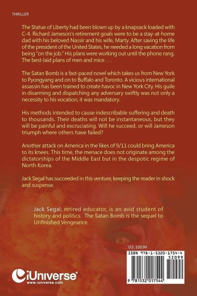 The Statue of Liberty had been blown up by a knapsack loaded with C-4. Richard Jameson's retirement goals were to be a stay-at-home dad with his beloved Nassir and his wife, Marty. After saving the life of the president of the United States, he needed a long vacation from being "on the job." His plans were working out until the phone rang. The best-laid plans of men and mice . . . The Satan Bomb is a fast-paced novel which takes us from New York to Pyongyang and on to Buffalo and Toronto. A vicious international assassin has been trained to create havoc in New York City. His guile in disarming and dispatching any adversary swiftly was not only a necessity to his vocation, it was mandatory. His methods intended to cause indescribable suffering and death to thousands. Their deaths will not be instantaneous, but they will be painful and excruciating. Will he succeed, or will Jameson triumph where others have failed? Another attack on America in the likes of 9/11 could bring America to its knees. This time, the menace does not originate among the dictatorships of the Middle East but in the despotic regime of North Korea. Jack Segal has succeeded in this venture, keeping the reader in shock and suspense.