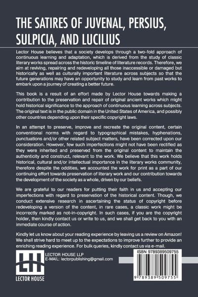 The Satires Of Juvenal, Persius, Sulpicia, And Lucilius: Literally Translated Into English Prose, With Notes, Chronological Tables, Arguments, &C. By The Rev. Lewis Evans To Which Is Added The Metrical Version Of Juvenal And Persius, By The Late William Gifford, Esq. This book is a result of an effort made by us towards making a contribution to the preservation and repair of original classic literature. In an attempt to preserve, improve and recreate the original content, we have worked towards: 1. Type-setting & Reformatting: The complete work has been re-designed via professional layout, formatting and type-setting tools to re-create the same edition with rich typography, graphics, high quality images, and table elements, giving our readers the feel of holding a 'fresh and newly' reprinted and/or revised edition, as opposed to other scanned & printed (Optical Character Recognition - OCR) reproductions. 2. Correction of imperfections: As the work was re-created from the scratch, therefore, it was vetted to rectify certain conventional norms with regard to typographical mistakes, hyphenations, punctuations, blurred images, missing content/pages, and/or other related subject matters, upon our consideration. Every attempt was made to rectify the imperfections related to omitted constructs in the original edition via other references. However, a few of such imperfections which could not be rectified due to intentional\unintentional omission of content in the original edition, were inherited and preserved from the original work to maintain the authenticity and construct, relevant to the work. We believe that this work holds historical, cultural and/or intellectual importance in the literary works community, therefore despite the oddities, we accounted the work for print as a part of our continuing effort towards preservation of literary work and our contribution towards the development of the society as a whole, driven by our beliefs. We are grateful to our readers for putting their faith in us and accepting our imperfections with regard to preservation of the historical content. HAPPY READING!