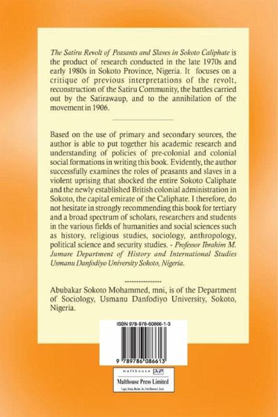 Based on the use of primary and secondary sources, the author is able to put together his academic research and understanding of policies of pre-colonial and colonial social formations in writing this book. Evidently, the author successfully examines the roles of peasants and slaves in a violent uprising that shocked the entire Sokoto Caliphate and the newly established British colonial administration in Sokoto, the capital emirate of the Caliphate. I therefore, do not hesitate in strongly recommending this book for tertiary and a broad spectrum of scholars, researchers and students in the various fields of humanities and social sciences such as history, religious studies, sociology, anthropology, political science and security studies. - Professor Ibrahim M. Jumare Department of History and International Studies Usmanu Danfodiyo University Sokoto, Nigeria.
