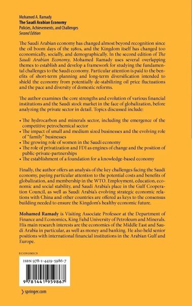 The Saudi Arabian economy has changed almost beyond recognition since the oil boom days of the 1980s, and the Kingdom itself has changed too economically, socially, and demographically. In the second edition of The Saudi Arabian Economy, Mohamed Ramady uses several overlapping themes to establish and develop a framework for studying the fundamental challenges to the Saudi economy. Particular attention is paid to the benefits of short-term planning and long-term diversification intended to shield the economy from potentially de-stabilizing oil price fluctuations and the pace and diversity of domestic reforms.The author examines the core strengths and evolution of various financial institutions and the Saudi stock market in the face of globalization, before analyzing the private sector in detail. Topics discussed include:-The hydrocarbon and minerals sector, including the emergence of the competitive petrochemical sector-The impact of small and medium sized businesses and the evolving role of "family" businesses-The growing role of women in the Saudi economy-The role of privatization and FDI as engines of change and the position of public-private-partnerships-The establishment of a foundation for a knowledge-based economyFinally, the author offers an analysis of the key challenges facing the Saudi economy, paying particular attention to the potential costs and benefits of globalization, and membership in the WTO. Employment, education, economic and social stability, and Saudi Arabia's place in the Gulf Cooperation Council, as well as Saudi Arabia's evolving strategic economic relations with China and other countries are offered as keys to the consensus building needed to ensure the Kingdom's healthy economic future.