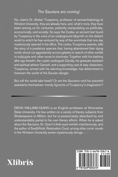 The Saurians are coming! No, claims Dr. Alistair Truepenny, professor of xenoarchaeology at Winston University, they are already here, and, what's more, they have been among us for centuries, patiently manipulating us politically, economically, and socially. So says the Codex, an ancient text found by Truepenny in the ruins of an underground labyrinth on the distant world to which he has ventured by way of the wormhole that one day mysteriously opened in his office. The codex, Truepenny asserts, tells the story of a predatory species that, having abandoned their dying world, struck out aggressively across galaxies in search of other worlds to subjugate and other races to dominate. Together with his dashing alter ego Anselm, the cryptic exolinguist Clavdia, his graduate assistant and spiritual advisor Ganesh, and a supporting cast of zany characters, Truepenny, armed with his alarming knowledge, has determined to forewarn the world of the Saurian danger. But will the world take heed? Or are the Saurians-and his assorted assistants themselves-merely figments of Truepenny's imagination?