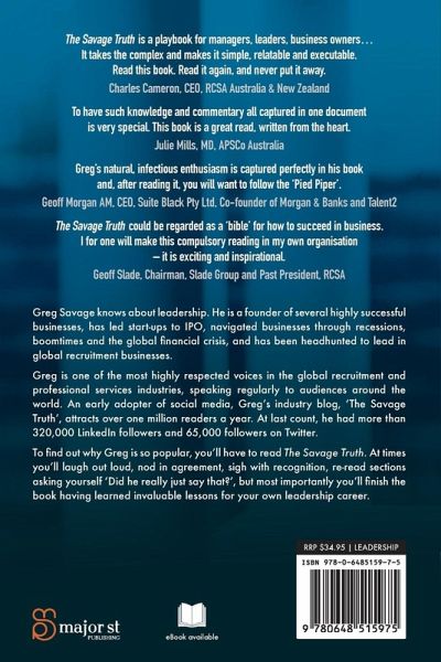 The Savage Truth is the story of Greg Savage, his stellar career in recruitment and the lessons he has learned on leadership, business and life over a career spanning four decades. The Savage Truth is a must-read for next generation leaders and lovers of business biography. It's a book in two parts. The first part covers Greg’s early life – the people and events that shaped him – and follows his career path, which took him from his hometown of Cape Town around the world before settling in Sydney. He gives an honest, open, often humorous account of his experiences, which reflect how much business has changed over the past 40 years. In the second part of the book, Greg distils his learnings into guidance and advice for his successors in the recruitment industry and, more broadly, to anyone working in business. He covers topics including building a personal brand, negotiating fees and margins, people leverage, performance management, ‘Savage’ leadership skills and preparing for exit towards the end of your career. Throughout his fascinating career, Greg has learned countless lessons in leadership, business and in life. One of his greatest achievements is his success as a communicator. Greg is one of the most highly respected voices across the global recruitment and professional services industries, speaking regularly to audiences around the world. An early adopter of social media for recruiters, Greg’s industry blog, The Savage Truth, is a must-read in the recruitment industry. In November 2018, he was named one of LinkedIn’s ‘Top Voices’.