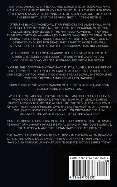 SciFi aficionado, Avery Blake, and sorceress of suspense, Ninie Hammon, team up to bring you The Saved. This is the fourth book in The Taken Saga, a terrifying tale of alien invasion told from the perspective of three very special young people. After the blind Apache girl, Star, predicts the aliens will wipe out humanity by flooding the earth, the inhabitants of Zion Village seal themselves in the Matheson Caverns - fighting their way through an army led by Paco, who tries to steal their hiding place. Even though food stores are low, once Paco is defeated and left for dead, they start to hope they will survive ... but their real battle for survival has only begun. When people start disappearing, the survivors realize that other creatures have sought refuge in the caverns too - cougars and wolves stalk stragglers from the group. Worse, they don't know that Paco is still alive, using his gift of mind control to turn the villagers against each other so he can seize control. When Paco's mind breaks down, the people he controls become mindless killing machines. Then there is the worst danger of all: four aliens have been sealed inside the caves too. While the villagers hunt wild animals and defend themselves from Paco's berserkers, Star and Noah must lead a daring suicide mission to lure the aliens into the old mine and blow it up. Can these young heroes save the last remnants of humanity without burying everyone alive ... or drowning them by allowing the waters above to fill the caverns? In a blockbuster conclusion to the four-book series, this small remnant of humanity makes its final stand. If they don't survive, the aliens win and the human race becomes extinct. The Saved is the fourth and final book in the new alien invasion series, The Taken Saga, by Avery Blake and Ninie Hammon. Get The Saved and finish your new favorite science fiction series today!