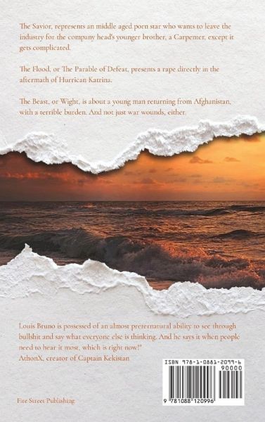 The Savior, the Flood, and the Beast, are three different plays all with various themes. The Savior, or The Carpenter, is about a young Carpenter, working in the porn industry for his brother, who ends up falling for the lead porn star, but his brother becomes secretly jealous of their affair. To the point that he won't let her quit the industry, either. The Flood, or The Parable of Defeat, is about a young girl whose life is destroyed by a rape in the aftermath of Hurricane Katrina In New Orleans. Coming to terms with it, but also finding out who the culprit is, too. The Beast, or Wight, is about a man who comes back from the Iraq/Afghanistan war with more than just scars to carry. Working in a grocery store, they learn the truth behind his awful secret.
