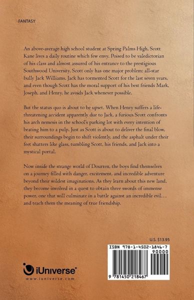 An above-average high school student at Spring Palms High, Scott Kane lives a daily routine which few envy. Poised to be valedictorian of his class and almost assured of his entrance to the prestigious Southwood University, Scott only has one major problem: all-star bully Jack Williams. Jack has tormented Scott for the last seven years, and even though Scott has the moral support of his best friends Mark, Joseph, and Henry, he avoids Jack whenever possible. But the status quo is about to be upset. When Henry suffers a life-threatening accident apparently due to Jack, a furious Scott confronts his arch nemesis in the school's parking lot with every intention of beating him to a pulp. Just as Scott is about to deliver the final blow, their surroundings begin to shift violently, and the asphalt under their feet shatters like glass, tumbling Scott, his friends, and Jack into a mystical portal. Now inside the strange world of Dourren, the boys find themselves on a journey filled with danger, excitement, and incredible adventure beyond their wildest imaginations. As they learn about this new land, they become involved in a quest to obtain three swords of immense power, one that will culminate in a battle against an incredible evil...and teach them the meaning of true friendship.