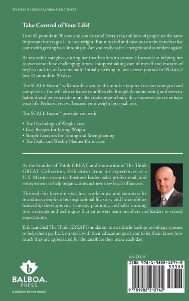 Take Control of Your Life! I lost 42 pounds in 90 days and you can too! Every year, millions of people set the same important fitness goal - to lose weight. But most fail and miss out on the benefits that come with getting back into shape. Are you ready to feel energetic and confident again? As my wife's caregiver, during her first battle with cancer, I focused on helping her to overcome these challenging times. I stopped taking care of myself and months of neglect took its toll on my body. Initially striving to lose sixteen pounds in 90 days, I lost 42 pounds in 90 days. The SCALE Factor will introduce you to the mindset required to start your goal and complete it. You will also enhance your lifestyle through dynamic eating and exercise habits that allow you to do more than reshape your body, they empower you to reshape your life. Perhaps, you will exceed your weight loss goal, too. The SCALE Factor provides you with: ¿ The Psychology of Weight Loss ¿ Easy Recipes for Losing Weight ¿ Simple Exercises for Toning and Strengthening ¿ The Daily and Weekly Planner for success