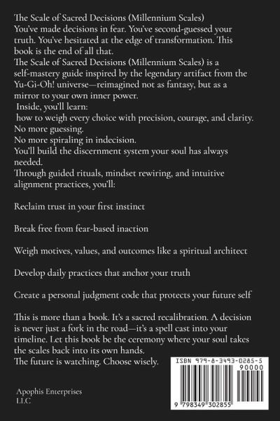 The Scale of Sacred Decisions (Millennium Scales) You've made decisions in fear. You've second-guessed your truth. You've hesitated at the edge of transformation. This book is the end of all that. The Scale of Sacred Decisions (Millennium Scales) is a self-mastery guide inspired by the legendary artifact from the Yu-Gi-Oh! universe-reimagined not as fantasy, but as a mirror to your own inner power. Inside, you'll learn how to weigh every choice with precision, courage, and clarity. No more guessing. No more spiraling in indecision. You'll build the discernment system your soul has always needed. Through guided rituals, mindset rewiring, and intuitive alignment practices, you'll:Reclaim trust in your first instinct Break free from fear-based inaction Weigh motives, values, and outcomes like a spiritual architect Develop daily practices that anchor your truth Create a personal judgment code that protects your future self This is more than a book. It's a sacred recalibration. A decision is never just a fork in the road-it's a spell cast into your timeline. Let this book be the ceremony where your soul takes the scales back into its own hands. The future is watching. Choose wisely.