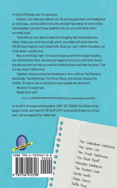 Meet your favorite new battling exes in this twisty, laugh-out-loud, novel that's perfect for teens and adults alike. Boone McReedy's a high school con artist and lovable badboy. Darby West's his ass-kicking ex-girlfriend who doesn't put up with anyone's crap, especially from Boone. But now that's Boone's been scammed out of $15,000, he and Darby must team up to save their parents' business. Using The Scam List, the secret how-to manual for budding con artists that belongs to Boone's incarcerated dad, Boone and Darby plan on earning the money by conning only the most deserving and offensive citizens of Batesville. That is if they don't kill each other first. As he did in his award-winning debut, DON'T GET CAUGHT, Kurt Dinan brings laughs, twists, and heart to THE SCAM LISTS' funny world of teen con artists, battling exes, and outrageous five-dollar bets.