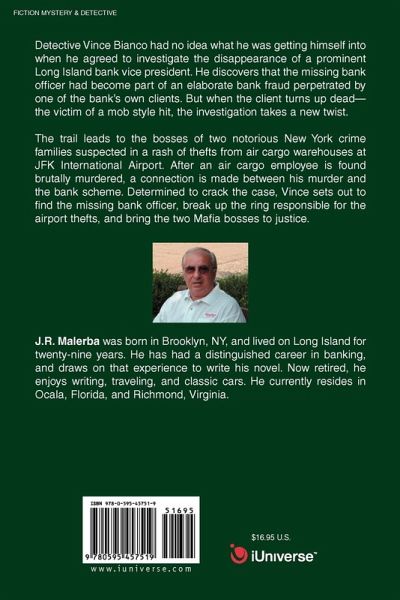 Detective Vince Bianco had no idea what he was getting himself into when he agreed to investigate the disappearance of a prominent Long Island bank vice president. He discovers that the missing bank officer had become part of an elaborate bank fraud perpetrated by one of the bank's own clients. But when the client turns up dead - the victim of a mob style hit, the investigation takes a new twist. The trail leads to the bosses of two notorious New York crime families suspected in a rash of thefts from air cargo warehouses at JFK International Airport. After an air cargo employee is found brutally murdered, a connection is made between his murder and the bank scheme. Determined to crack the case, Vince sets out to find the missing bank officer, break up the ring responsible for the airport thefts, and bring the two Mafia bosses to justice.