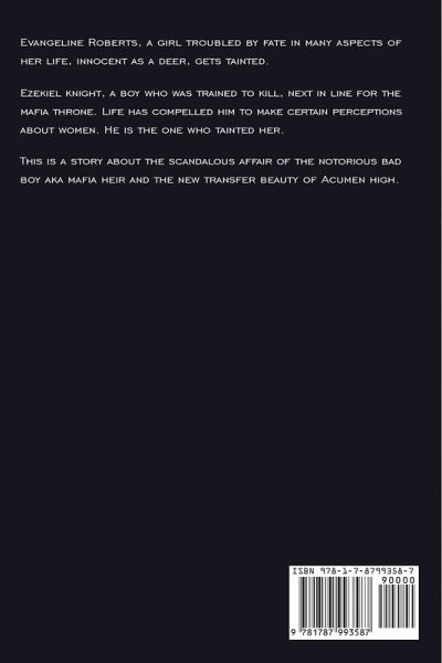 Evangeline Roberts, a girl troubled by fate in many aspects of her life, innocent as a deer, gets tainted. Ezekiel knight, a boy who was trained to kill, next in line for the mafia throne. Life has compelled him to make certain perceptions about women. He is the one who tainted her. This is a story about the scandalous affair of the notorious bad boy aka mafia heir and the new transfer beauty of Acumen high.