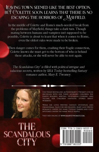 Leaving town seemed like the best option, but Colette soon learns that there is no escaping the horrors of Mayfield. In the middle of Colette and Rome's much-needed break from the problems of Mayfield, things take a dark turn. Though mating between humans and vampires isn't supposed to be possible, Colette is about to learn that when it comes to Rome, even the oldest rules were made to be broken. When danger comes for them, crashing their fragile connection, Colette knows she must get to the bottom of who is behind these attacks, or she will never be able to rest again. "The Scandalous City" is filled with political intrigue and salacious secrets, written by USA Today bestselling fantasy romance author, Mary E. Twomey.