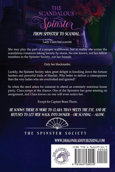 From Spinster to Scandal... Lady Clara has a secret. She may play the part of a proper wallflower, but in reality she writes the scandalous romances taking Society by storm. No one knows, not her fellow members in the Spinster Society, not her friends. Only her blackmailer. Luckily, the Spinster Society takes great delight in knocking down the fortune hunters and powerful lords of Mayfair. Who better to deliver a comeuppance than the very ladies who are overlooked and ignored? So when the need arises for someone to attend an extremely notorious house party, Clara jumps at the chance. One of the Spinsters has gone missing on assignment, and Clara knows no one will even notice her. Except for Captain Bram Thorn. He knows there is more to Clara than meets the eye. And he refuses to let her walk into danger-or scandal-alone. The Spinster Society Book 1 - A Scandalous Spinster Book 2 - A Deal with the Devil Book 3 - Seduced by a Scoundrel